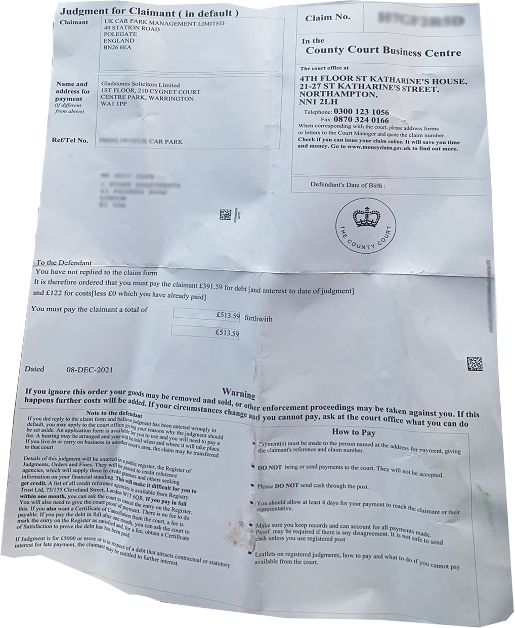 You can also check if a Claim number has a County Court Judgement registered against it by visiting TrustOnline - https://search.trustonline.org.uk/Search/CaseNumber